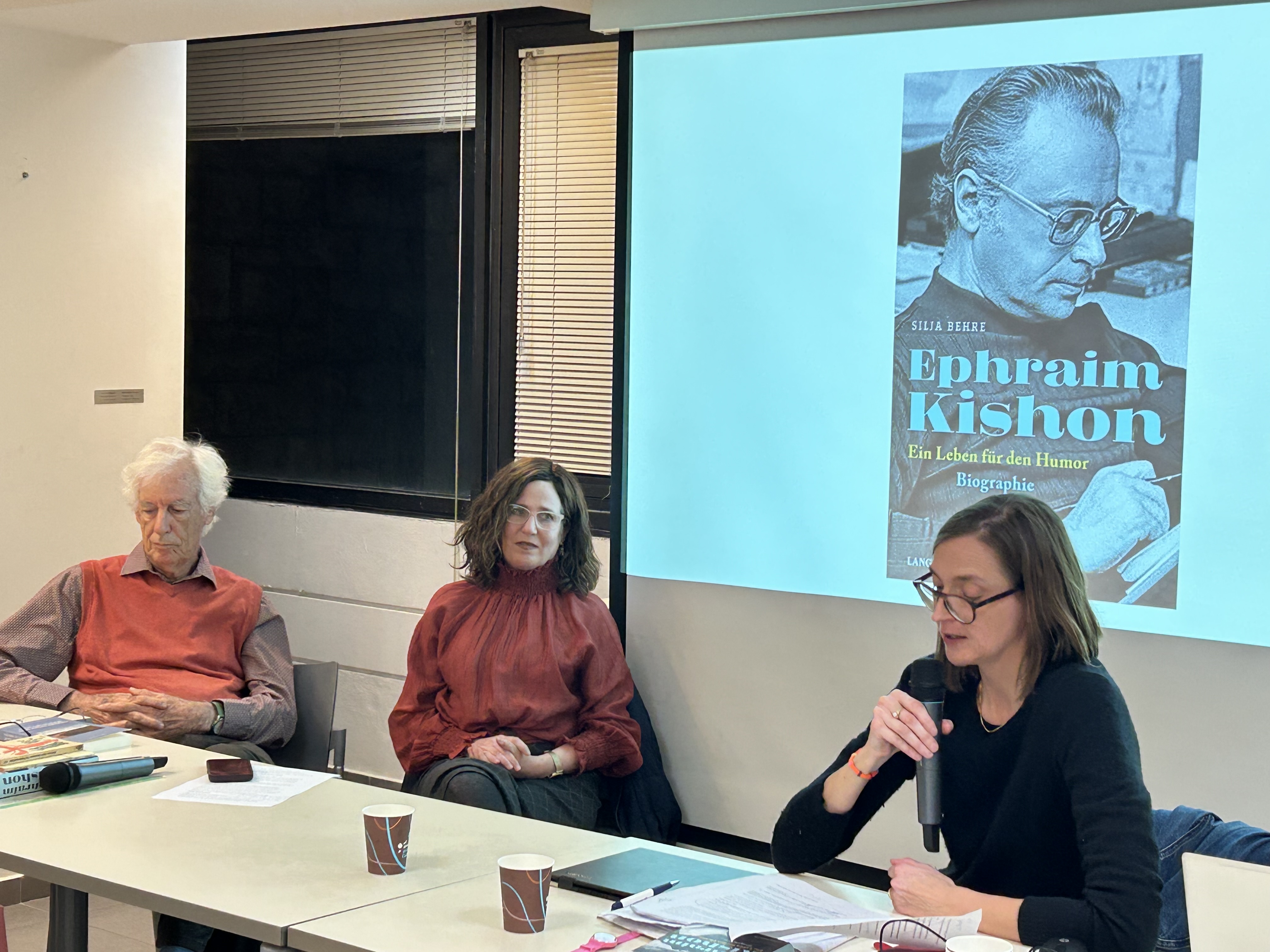 ד"ר סיליה בר, חוקרת עצמאית בהיסטוריה עכשווית ומחברת הביוגרפיה של קישון, מציגה את ספרה יחד עם פרופ' משה צימרמן, אמריטוס, האוניברסיטה העברית.
